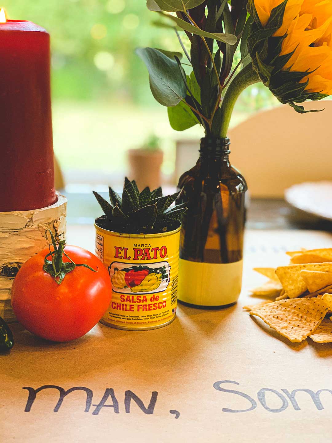 Recycled tin cans were the perfect fit for succulents. They also added a bit of spice and color to the table. Exotic looking flowers and sunflowers in recycled brown kombucha bottles added the height I always go for. Tomatoes and jalapenos from my garden brought another layer of texture and more color. Red pillar candles gave the table a bit more atmosphere. The final step and the most fun, was placing tortilla chips down the center of the table with bowls of salsa spread through out for our guests to help themselves as they ate.